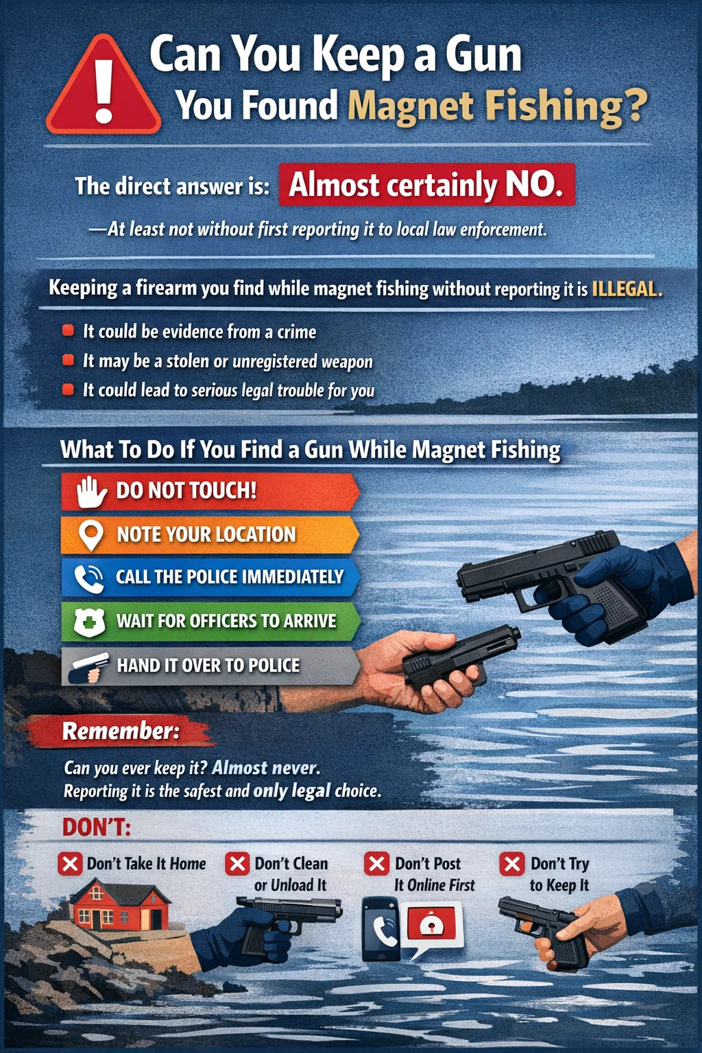 A rövid válasz a következő: szinte biztosan nem – legalábbis anélkül, hogy először jelentené a helyi bűnüldöző szerveknek. Az Egyesült Államok legtöbb államában, valamint az Egyesült Királyságban, Kanadában és Ausztráliában illegális a vízből horgászmágnessel kihúzott lőfegyver tartása anélkül, hogy jeleznéd. A pisztoly bizonyíték lehet egy bűncselekményre, lopottként jelentett be, vagy nem regisztrált fegyver – ezek bármelyike komoly jogi kitettséget jelent az Ön számára abban a pillanatban, amikor úgy dönt, hogy elhagyja.