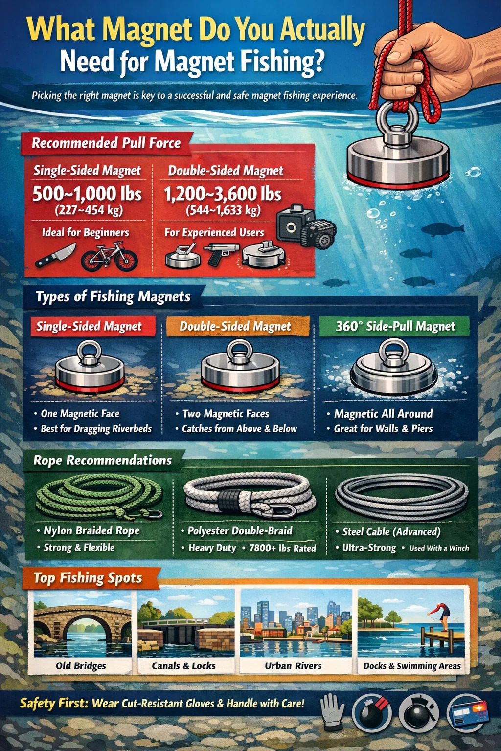 A rövid válasz: a legtöbb kezdő számára a egyoldalas neodímium mágnes 500–1000 font (227–454 kg) húzóerővel ideális kiindulópont a mágneses horgászathoz. Elég erős ahhoz, hogy késeket, szerszámokat, kerékpárokat és még széfeket is kiszedjen a folyókból és tavakból, ugyanakkor elég jól kezelhető ahhoz, hogy speciális felszerelés nélkül is biztonságosan kezelje. Ha Ön tapasztaltabb, vagy nehezebb tárgyakat céloz meg mély vízben, egy 1200–3600 font közötti kétoldalas mágnes a jobb választás.