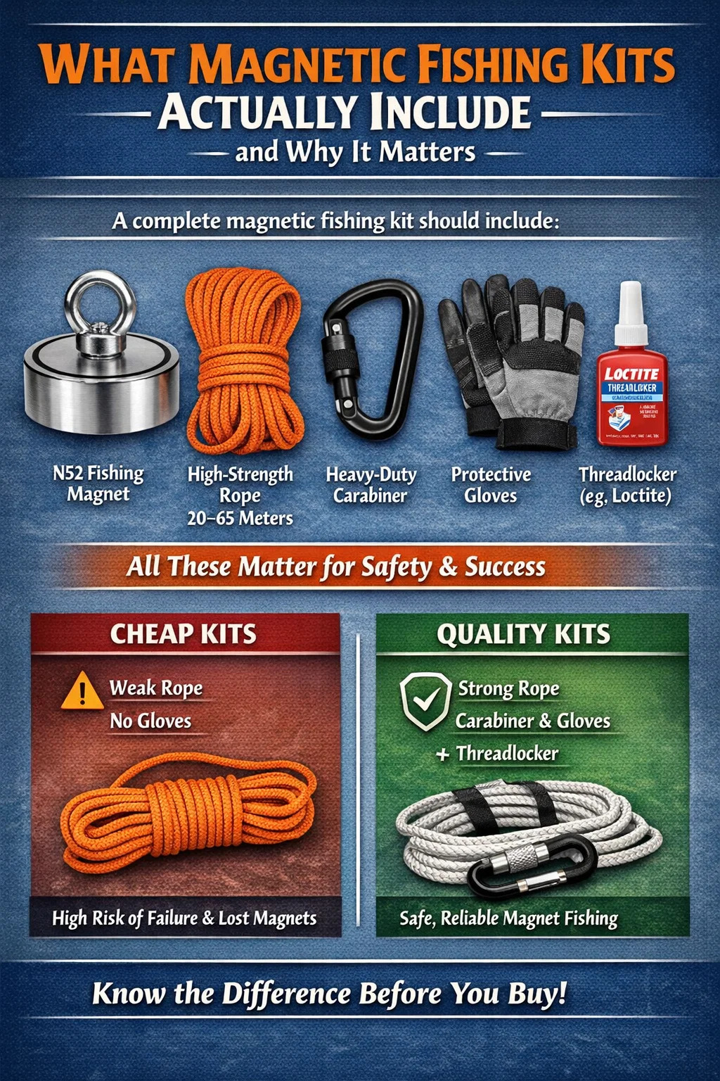Ha egyértelmű választ keres: egy komplett mágneses horgászkészlet tartalmaz egy neodímium horgászmágnest, egy nagy szakítószilárdságú kötelet (általában 20-65 méter), egy rögzítő karabinert, védőkesztyűket és gyakran egy menetreteszelő anyagot, mint a Loctite. Ezek az összetevők együttesen határozzák meg, hogy a mágneses horgászat eredményes és biztonságos-e – vagy frusztráló és veszélyes. Az online mágneses horgászközösségekben jelentett balesetek és elveszett mágnesek többségét a kesztyűt kihagyó vagy alacsony minőségű kötelet használó olcsó készletek okozzák.