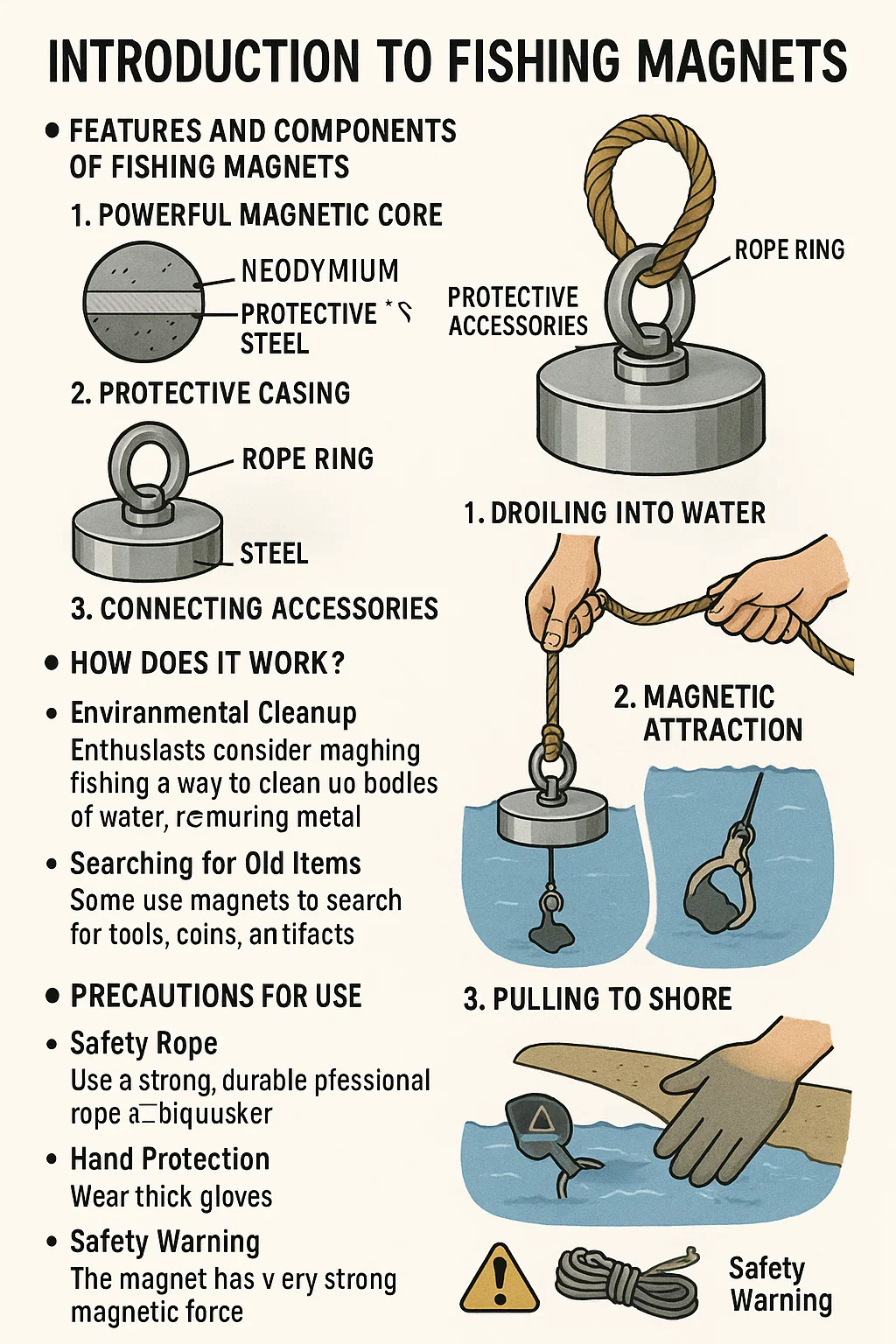 A horgászmágnes, ahogy a neve is sugallja, egy erős mágneses eszköz, amellyel a víztestek alján vagy nehezen elérhető helyeken vastartalmú tárgyakat "halásznak". Erős mágneses erőt használ a fémtárgyak vonzására és visszaszerzésére, helyettesítve a hagyományos horgokat és zsinórokat.